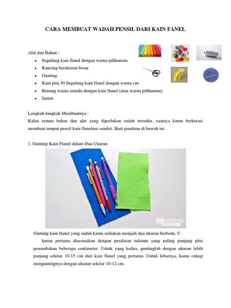 05 05 2022 Ada kok langkah menyelenggarakan kawasan pensil dari kain flanel yang gampang dipraktikkan oleh siapa pun termasuk olehmu tentunya Berikut ini yaitu panduannya Alat dan Bahan Membuat Tempat Pensil dari Kain Flanel Segulung kain flanel dengan rona pilihanmu Kancing berukuran besar Gunting Kain pita 30 cm Benang warna senada dengan kain flanel atau warna pilihanmu Jarum Langkah langkah Membuat